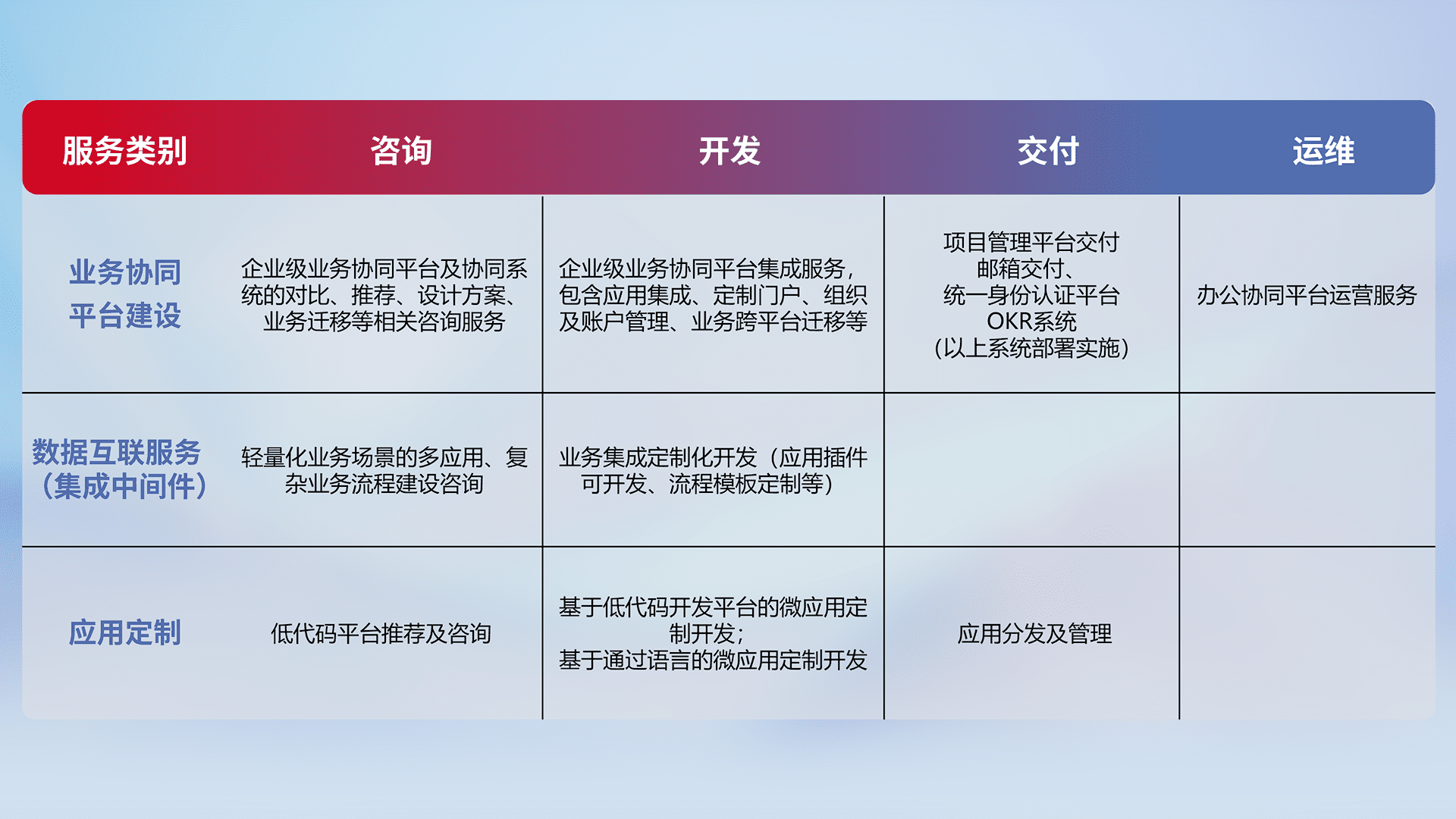 针对钉钉、、、企微、、、、IDaas等平台级产品提供产品的规划、、、、方案、、交付、、定制化开发等服务,,,实现如统一协同办公、、智能客户服务、、、混合会议管理、、、、智能数据查询、、、等业务场景,,实现数字化转型。。。