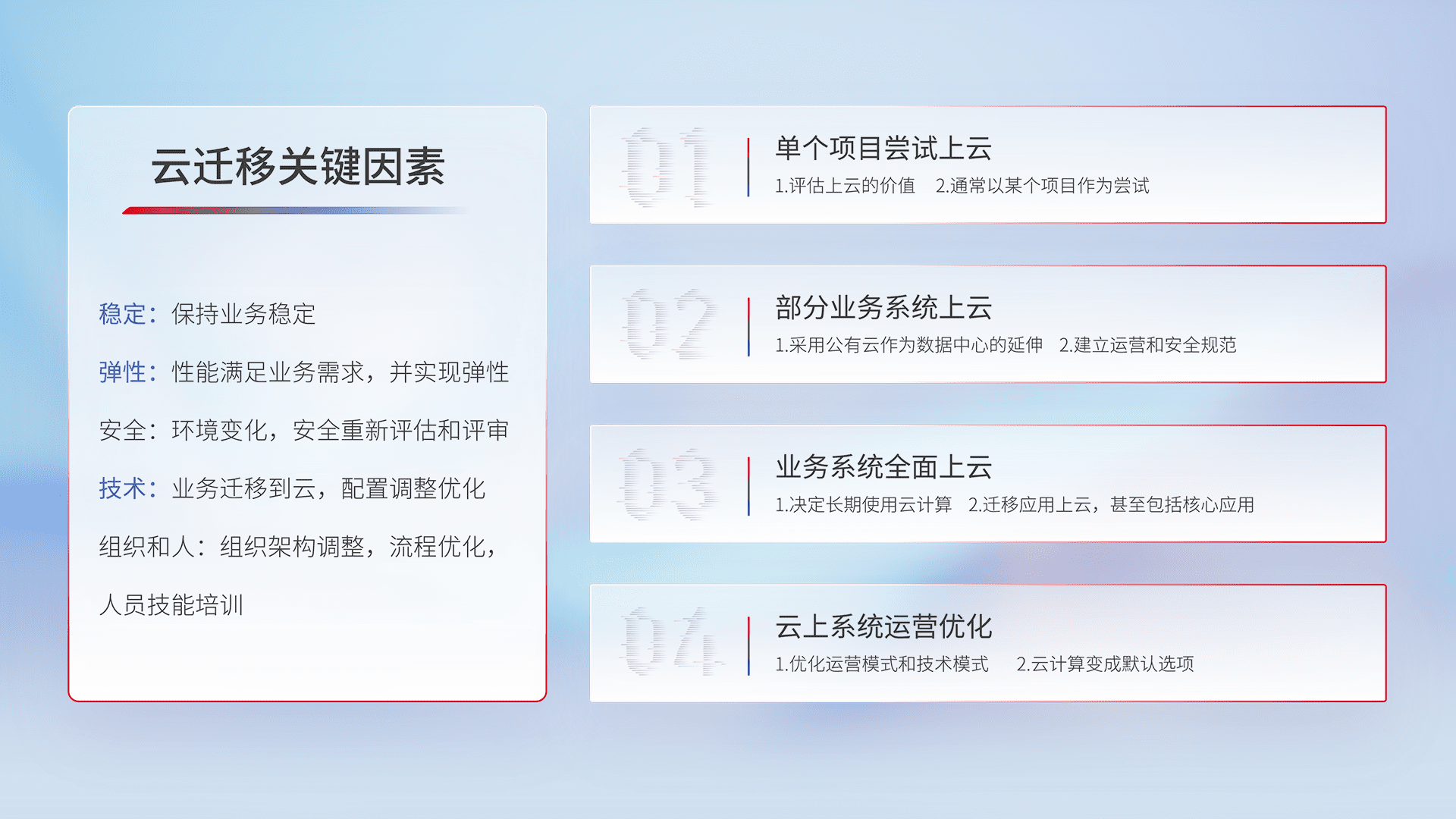 结合实际业务,,,从规划设计、、云平台选型、、、、云原生改造、、、、数据迁移、、集成交付,,迁移全过程为客户识别最佳上云路径,,,,做好风险识别管理,,设计网络架构、、身份权限、、、安全审计合规、、操作审计、、、日志审计、、、监控告警策略、、、、多站点容灾设计等,,对云上基础设施进行整体规划,,,,提升IT治理水平,,以满足弹性、、高可用、、高性能的需求。。。。