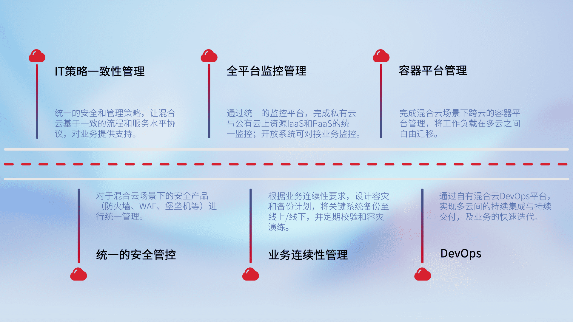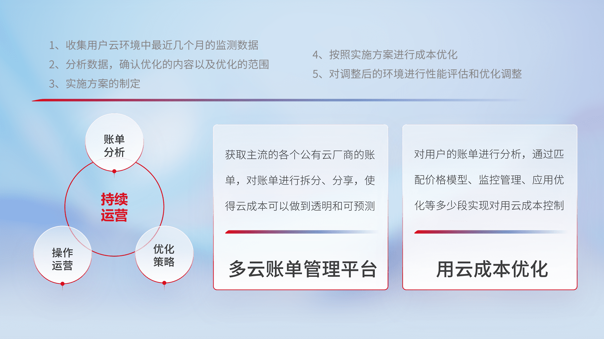 通过多云纳管,,,,以统一的资源数据模型把客户的云资源进行抽象和封装,,,,进而实现对多云资源的统一操作,,保障云资源管理的可靠性、、、稳定性与可用性。。。。量身定制化运维内容,,配置、、、开发运维、、、补丁管理、、、、备份、、、监控、、、认证和访问管理、、、审计和日常巡检等,,,保障在用云过程中的可靠度,,,,稳定度以及高可用率。。